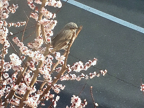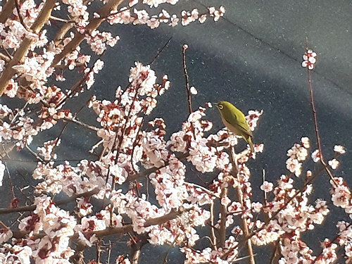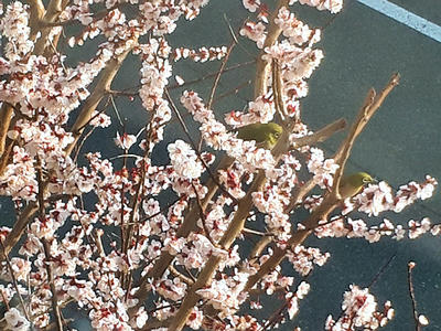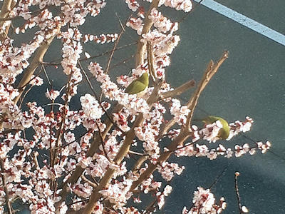 先日の大粒の雨で、可愛い花びらの見る影もなくなってしまった梅ですが、今朝ふと二階の窓から見下ろすと、メジロが番いでやってきていました。