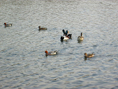 広い池にはたくさんのオシドリやカモたち。