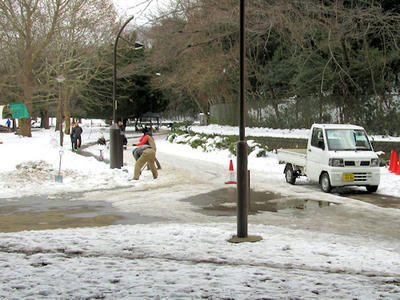 凍った道を叩いて取り除いているところに遭遇。