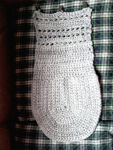 ダンナはいつも短いジャケットなので、単体で敷けるように丸いものを編みました。