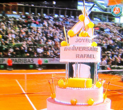 さて、6月3日はラファの27才のお誕生日。いつも全仏の間に皆に祝ってもらうのが恒例ですが、今年は試合後にコートにケーキが用意されました。