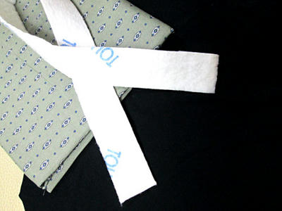 さて、これにマイナスイオンシートを挟んでフカフカのベースを作り、その上にテープをつけます。今回はプロヴァンスっぽいデザインのはぎれを見つけたので、これを使いました。柄もうまく出せました。