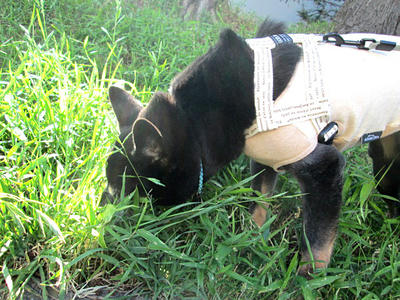 やはり犬がこんなものに乗っているのはまだ珍しいらしく、すれ違う人が「えっ?」と言って振り返ったりしていきましたが、ネフティーは人間でいえば、もう80歳ですからね。