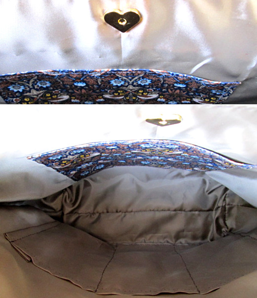 ハート型のマグネットホック。バッグ自体が30cm以上と少し大きめなので、中にはたくさんポケットを作りました。底板も仕込んであります。