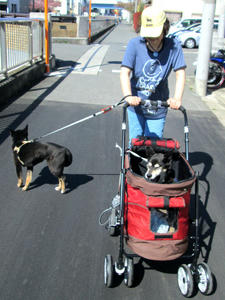このバギー、もちろん折り畳みができて、前後輪にサスペンションがついているのでスムーズです。後面をはずすと犬が昇り降りのできるスロープにもなります。手元にハンドブレーキがついているので安心。車輪の音はほとんどしません。いつもは車(人間用)の後ろに積んでいます。