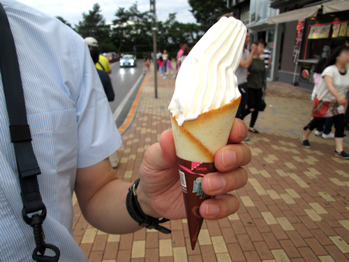 氷を使わずに、凍らせたいちごのスライスに濃厚なソフトクリーム。