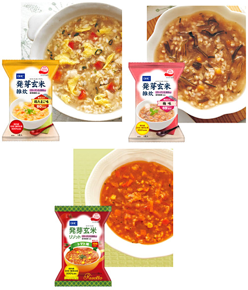 鶏たまご味は80kcal、梅味は69kcal、リゾットトマト味は106kcal。