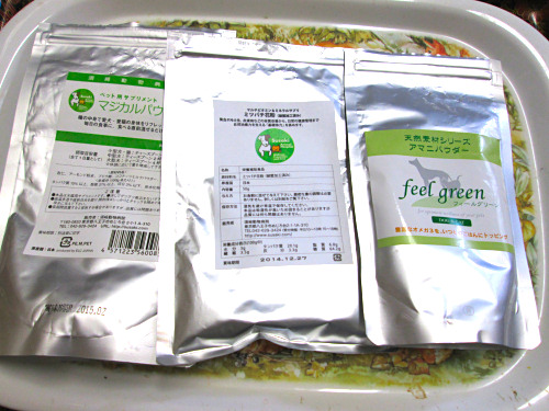 フードに煮たものをかけて、食べる歯磨きと酵素入り青汁のパウダーを加えました。
