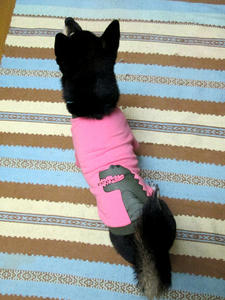 黒い犬は夏に白いTシャツを着れば暑さは多少軽減されますし、旅行の時には毛抜けを防げます。