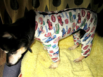 二枚ほど簡単に作ってみて、ここはもっと長い方が動きやすいとか、お腹の部分はもっと長くても大丈夫とか確認をして、ようやく完成したのがこの第一号。点数をつけるなら、90点くらいかなあ。