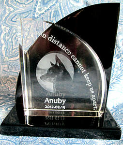 アヌビーの盾をつくりました。ガラスと漆のとてもきれいなものです。レーザーで顔や文字を彫ってもらいました。黒い犬はこういう時、正面の顔だとはっきりしないので、あえて横顔を選びました。アヌビーの大好きな場所で写した写真です。