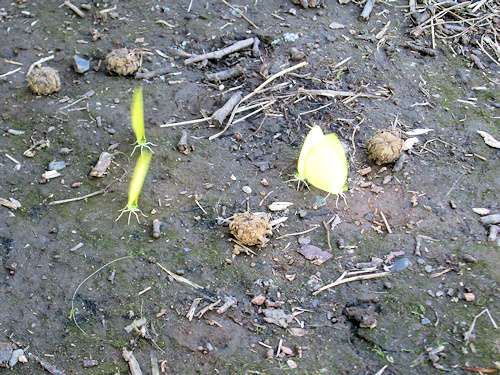 橋の手前のベンチでひと休みしていると、たくさんの黄色い蝶が集まっていました。