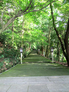 高くそびえる老杉並木の参道が続きます。時々木漏れ日が差し込み、静かで特別な空間のようです。