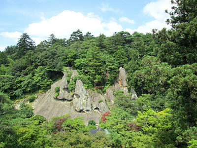 奇岩霊石がそそりたち、その下の蓮池には巨大な鯉がたくさんいます。ここは、その昔海底噴火の跡と伝えられています。