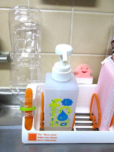 ついでに洗剤ラックも新調したんですが、間のついたてが移動できるだけでなく、両側にペットボトルを乾燥させるフックがついているのでとても便利です。