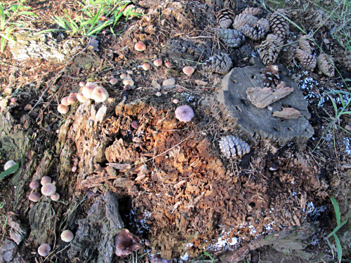 切り株にいろいろなキノコと松ぼっくり。
