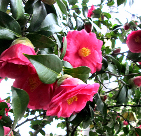 毎年たくさんの大きな花を見せてくれる椿ですが、今年も鈴なりです。