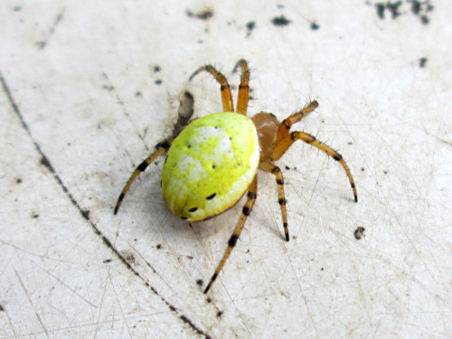 ふとテーブルの上を見ると、こんなきれいなクモが。