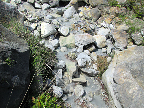白く濁ったお湯に手を入れてみると…結構熱いです。