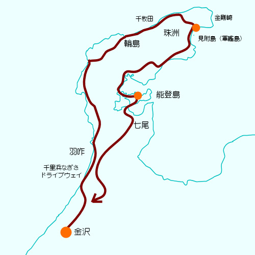 金沢から出発して、外灘を走って珠洲で一泊。内灘を通って能登島で一泊。
