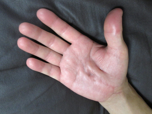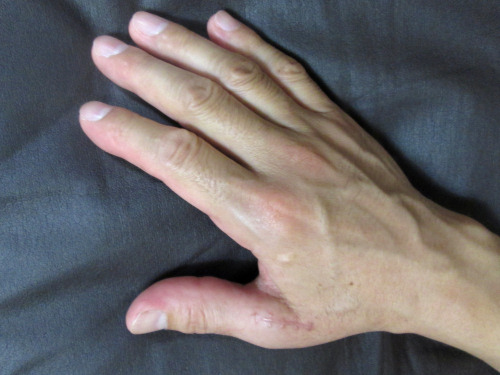 お医者さんからは、暴力的でないかぎり、どんどんリハビリして下さいと言われているそうですが、親指の付け根から関節などが固まっていて、節々が確認できないくらい棒状になっています。
