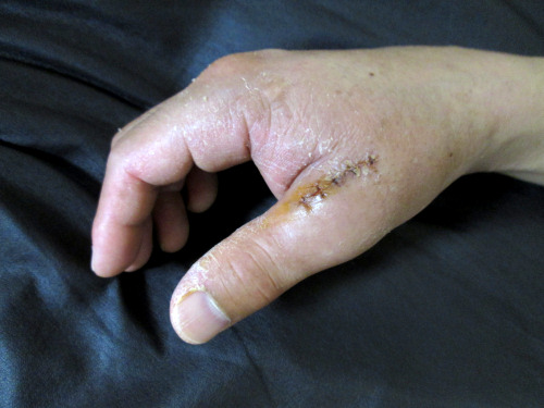 傷は手のひらを縦断するくらい大きいようです。