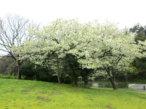 参道の先にある桜は、今年はすでに半分くらいなくなっていましたが、近づいていくと、不思議な軌道でくるくるとたくさんの花びらが落ちてきました。