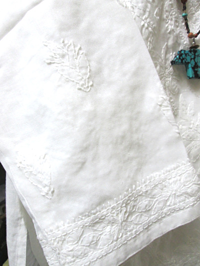 インドの服はかなり派手めなのでおとなしいものを探すのに苦労しますが、これはガーゼ生地にラクナウチカン刺繍が全面に施されている、手刺繍の贅沢なもの。