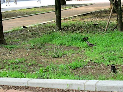 最近は元々飼われていたセキセイインコが野生化して、すごい数の群れをなしているのをよく見かけますが、ここの公園にはいないようですね。