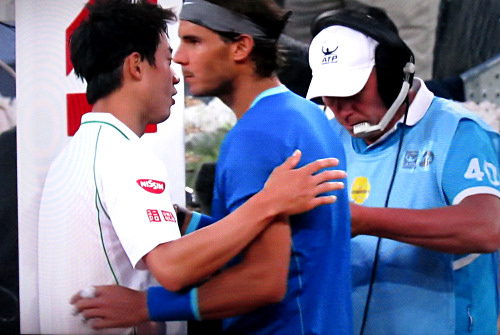 第二セットはラファが取り、第三セットの半ば、錦織くんは迷いに迷った挙句、棄権しました。