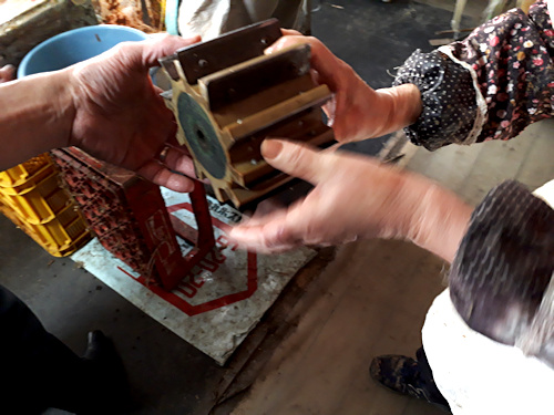 次はこの歯のついた麻ひき機で、繊維垢を削り取ります。