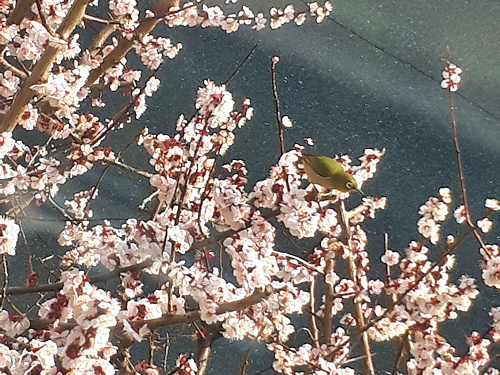 先日の大粒の雨で、可愛い花びらの見る影もなくなってしまった梅ですが、今朝ふと二階の窓から見下ろすと、メジロが番いでやってきていました。