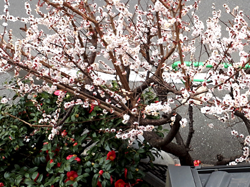 梅の隣りにはこんな風に、大きな花をつけた椿が咲いているんですが、実はここに隠れていました。