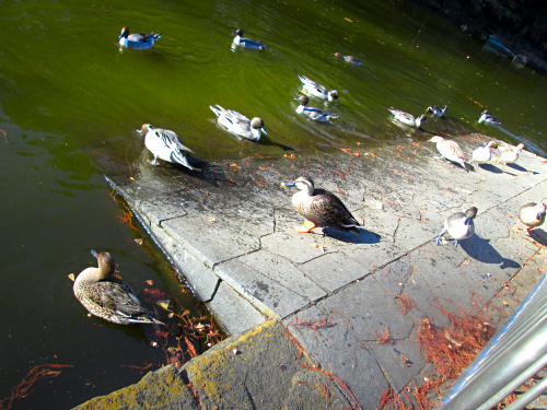 ここの池が汚れないように、パンなどを投げないようにと張り紙がしてあるのですが、その紙の前でパンをちぎってやっている人あり。