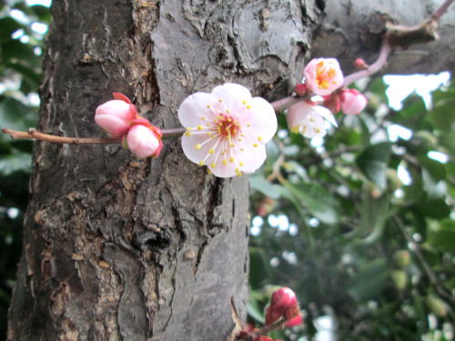 先日まで小さい蕾だった我が家の梅は、いつのまにか膨らんで次々と花を咲かせています。
