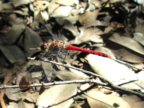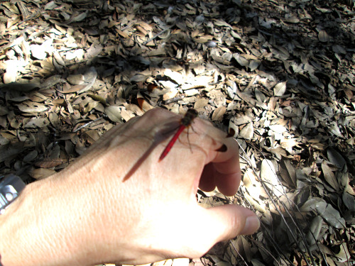 かなりたくさんトンボが飛んでいるんですが、歩いているとふと足元に赤トンボが一匹。