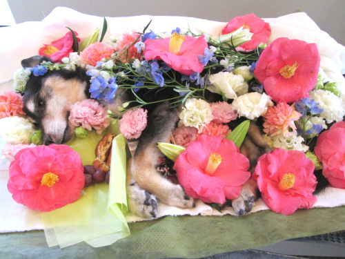 見送る時にはお花と、今うちで真っ盛りに咲いている椿の大きな花で飾ってやりました。