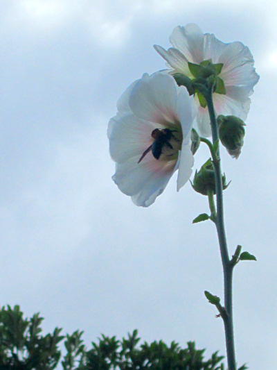 私の好きなタチアオイの花に、大きい蜂が何匹も来て蜜を吸っていました。