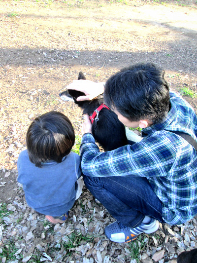 近くで遊んでいた子供に気に入られて、べったり。笑