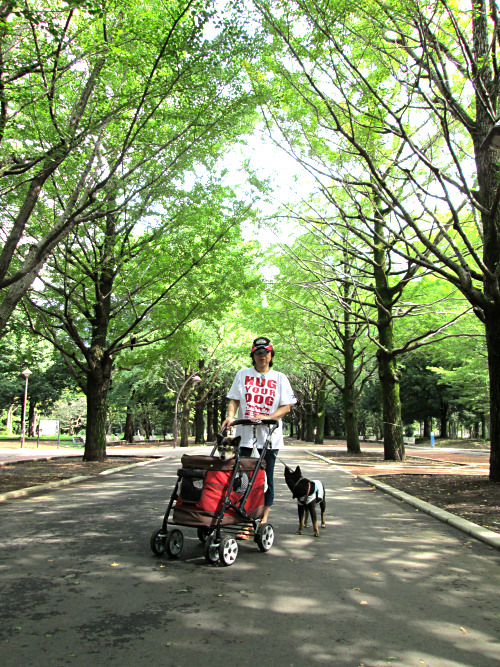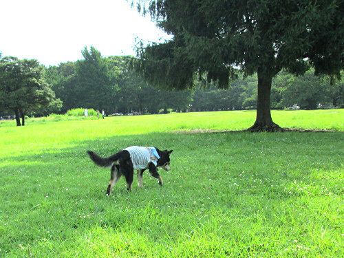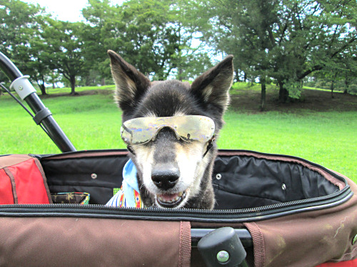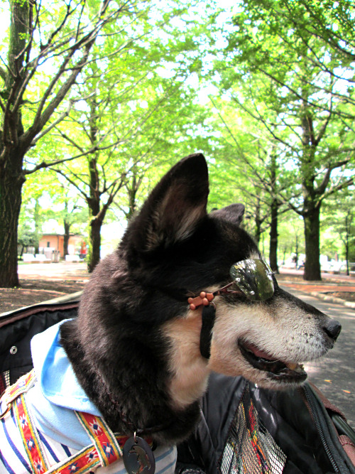 今朝もとても空気がきれいで清々しかったので、いつもの公園に行きました。直射日光が強かったので、これ以上白内障を進行させないためにも、ゴブリンたちにはサングラス着用。以前の完璧なゴーグルタイプに比べて、嫌がりません。