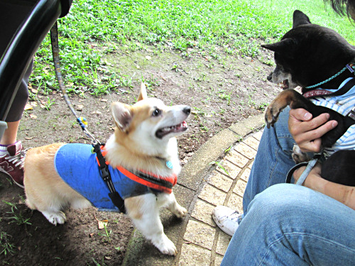 最初にお友達になった7ヵ月のコーギーちゃん。残念ながら、今日はそういう気分じゃないナイルはご機嫌斜め。困ったもんだ…。それでもめげずに”遊んでくれ”攻撃。