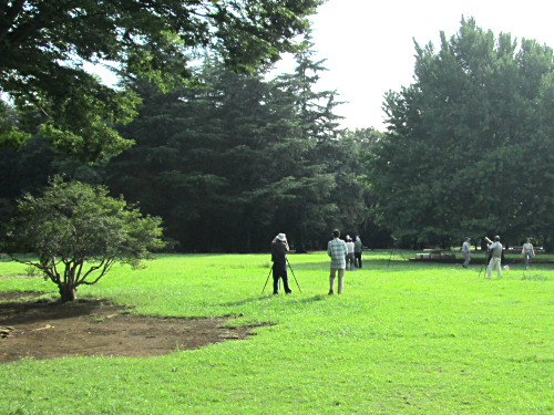 公園では異変勃発です。パパラッチのように、大勢のカメラを抱えた人たちが何やら木の上の方を眺めています。実際には写真よりずっと多くの人たちがいました。