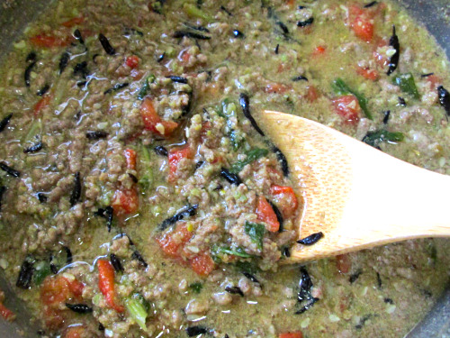 馬肉、大根の葉、ゴマ、さつまいも、ひじきを入れて煮ました。