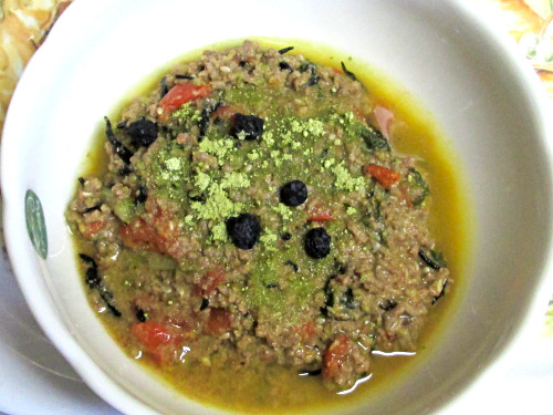 フードに煮たものをかけて、食べる歯磨きと酵素入り青汁のパウダーを加えました。