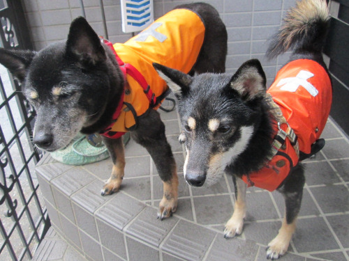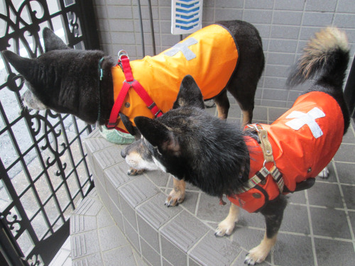 さて、午後に雨がちょっと止んだので、一応レインコートを着せて散歩に行きましたが、途中から小雨がしとしと。