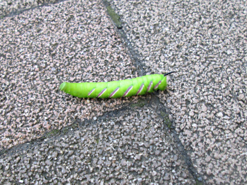 このまま行くと車に轢かれる恐れがあるので、ダンナが葉っぱの上に乗せて植え込みに戻してやりました。