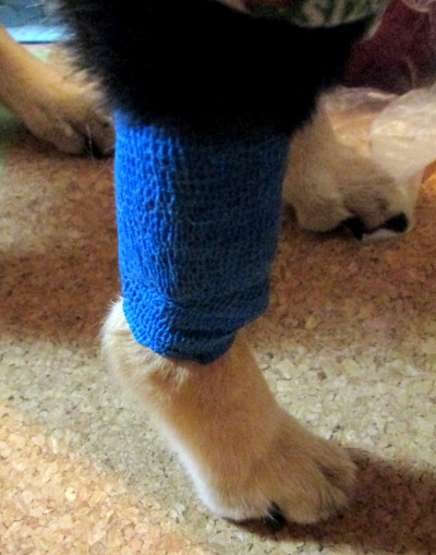 右前脚の包帯の下には、点滴のための細くて柔らかい針が入っています。