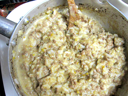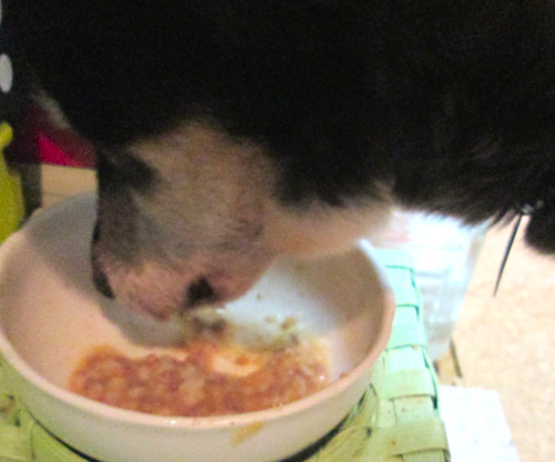 晩御飯はレバー入り馬肉のミンチと白米、かぼちゃのフレークとヤギミルク、それにりんごのすりおろしを少し。