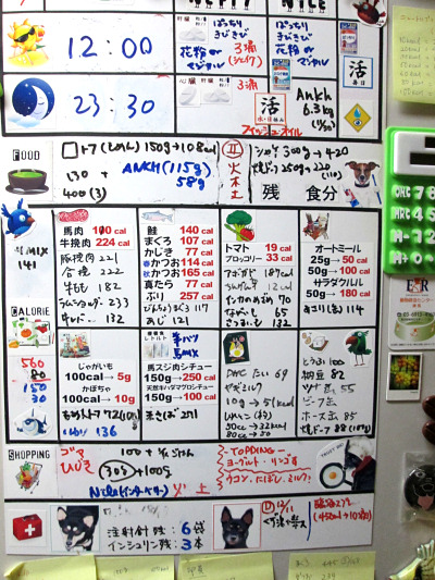 朝夕の注射の時間、ご飯のカロリー、食材の買い物、在庫などなど。