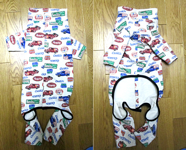 二枚ほど簡単に作ってみて、ここはもっと長い方が動きやすいとか、お腹の部分はもっと長くても大丈夫とか確認をして、ようやく完成したのがこの第一号。点数をつけるなら、90点くらいかなあ。